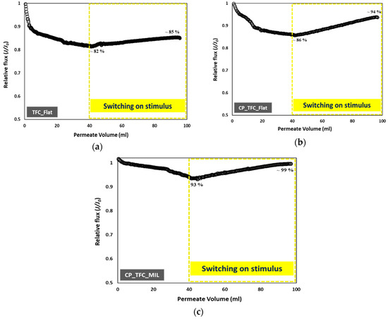 The influence of stirring, as an added stimulus, on the silica fouling of three representative membranes was examined. TFC_Flat was selected as the reference sample (i.e., unmodified and not patterned), while CP_TFC_Flat and CP_TFC_MIL were chosen to investigate the impact of hydrogel coating only, as well as synergistic influences of hydrogel coating and surface micro-patterning. The stirring stimulus was described in Section 2.5.2. The filtration period (at which point the stirring stimulus was triggered) was defined based on the examined fitting range of the colloidal fouling data to the cake filtration model (see Section 3.3). As mentioned previously, the cake filtration model was the dominant fouling mechanism in all colloidal fouling systems when a permeate volume of 15 mL was collected. Moreover, in order to ensure formation of the silica cake layer, the stirring stimulus was triggered upon collecting a permeate volume of 40 mL. The results, represented by graphs of relative flux plotted vs. permeate volume, are presented in Figure 9.