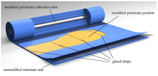 The sectioned module with modified permeate pockets and a modified permeate collection tube. The retentate side is unmodified. For comparison, an unmodified SWM can be found in the supplementary.