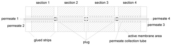 A modification of the permeate channel was necessary to avoid axial mixing of permeates originating from different positions in the SWM. Therefore, the permeate pockets were sectioned into four compartments in axial direction prior to winding the membrane sheet around the permeate tube. The sectioning was realized by three equidistant, radially oriented glue strips in each permeate pocket (Figure 5). Thereby, the same technique was applied as for tightening flat sheets to form the permeate pockets. The glue strips reduced the active filtration area of the sectioned SWM by approximately 25% to 14.3 m2. However, the glue strips offer another advantage in addition to the avoidance of permeate stream mixing: since no volume can be exchanged between the different compartments, no pressure equalization can take place. Thus, the permeate pressure can be regulated separately in each section. This means that a length-dependent ΔpTM adjustment can be carried out by controlling the permeate pressure. Furthermore, the retentate pressure specific to the section can be measured. When the permeate throttles are closed, the pressure in the permeate sections corresponds to the mean pressure on the retentate side, and therefore becomes accessible.
