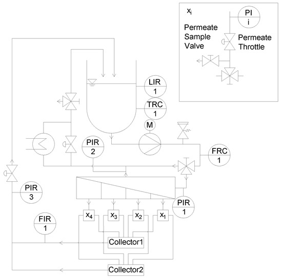 In order to be able to analyze, monitor, and control the filtration performance of each section separately, the membrane filtration plant (Figure 1) had to be modified too (Figure 7). For the analysis and quantification of the individual permeate composition of each section, each permeate stream was forced into a separate flow path including a sampler. Four pressure gauges were installed in the four different flow paths to monitor the pressure in each of the four sections. To control the permeate pressure, and thus ΔpTM, a throttle was integrated in each section. The permeates were directed to either collector 1 or 2 via a three way valve, connected to the flow meter or a bypass. Thus, a selective permeate flow measurement could be performed. After the individual flow measurement, all permeates were merged to a combined permeate stream, which could again be throttled. This design also made it possible to monitor and control the total permeate pressure, and not only the individual sections.