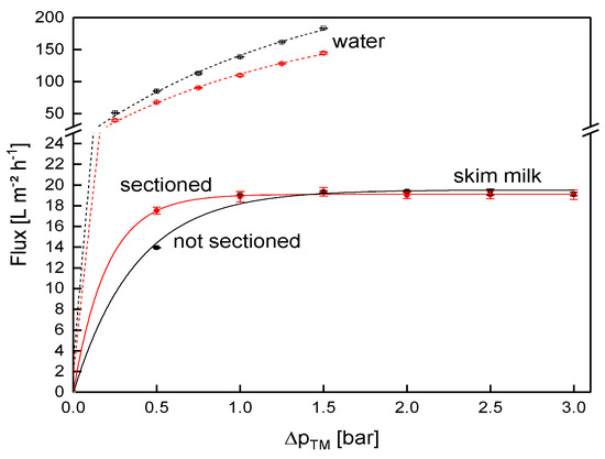 Flux as a function of the transmembrane pressure (ΔpTM) for the sectioned and a non-sectioned SWM (length of 0.96 m) during filtration of water and skim milk at a mean crossflow velocity of 0.42 m s−1.