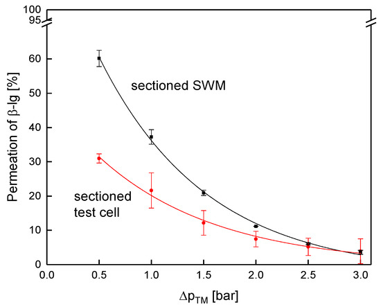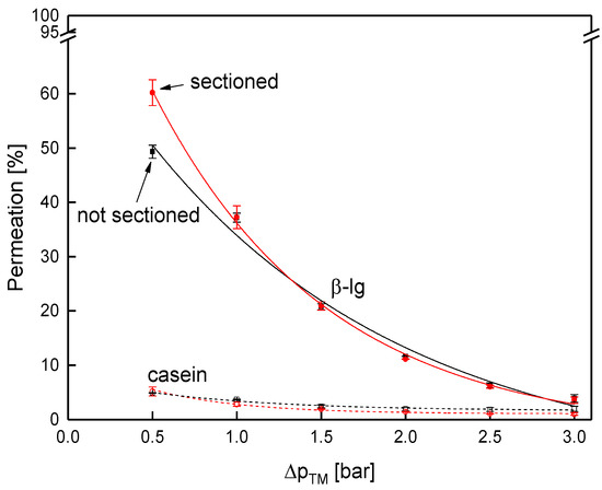 Contrary to that, protein permeation was considerably lower in the sectioned test cell compared to the sectioned membrane (Figure 14). At 0.5 bar, permeation of β-lg was 32% and 60%, respectively.