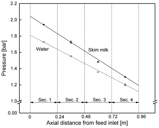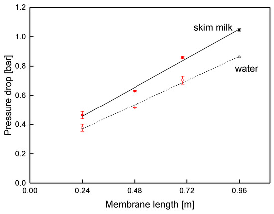 In order to prove the validity of this approach, the pressure drop was also studied via membranes with different lengths (Figure 11) at a fixed crossflow velocity of 14 m3 h−1 (mean crossflow velocity of 0.42 m s−1). In accordance with the results from the sectioned membrane, the pressure decreased linearly, with a slope of −0.83 and −0.69 bar m−1 for skim milk and water, respectively. Since the slope corresponds to the data shown in Figure 10, pressure drop in SWMs can be assessed with both kinds of prototypes, as no effect of the module shape was observable.