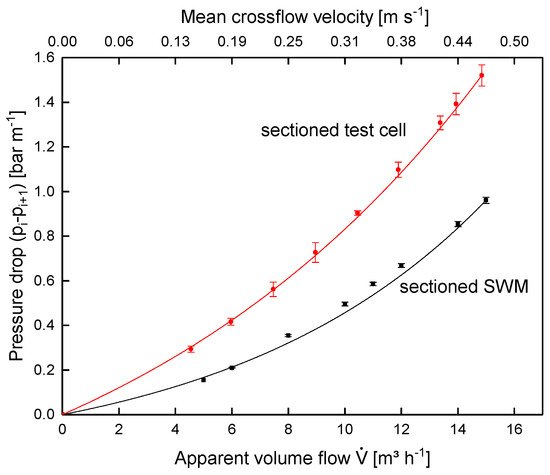 Pressure drop in the sectioned SWM (length of 0.96 m) at a mean crossflow velocity of 0.42 m s−1.