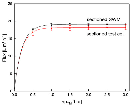 Below the limiting flux, there was a slight difference between the two SWMs. In this pressure range (0.5 bar), the filtration performance was rather controlled by the membrane than by the deposit layer, as was the case for the limiting flux. A possible explanation for the deviation is that a pressure alignment appeared in the permeate pocket of the non-sectioned module. More permeate was produced close to the membrane inlet, due to the higher ΔpTM [4]. Therefore, permeate flowed to the rear part of the membrane (in axial direction) inside the permeate pocket, and thus increased permeate pressure in the rear of the module. On that account, ΔpTM was slightly lower in the rear part compared to the sectioned membrane, where this effect could not occur due to the glued separations. Furthermore, the variability of membrane performance in one batch is known for polymeric membranes. This explains the differences in water flux values between the modified and the unmodified membrane. Overall, however, the deviation was considered acceptable.