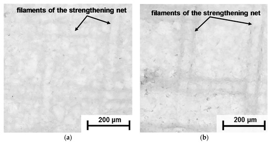 The occurrence of diffusion pathways along the filaments of reinforcing net of swollen heterogeneous membranes can be observed although in the process of moisture evaporation from these membranes, as in the case of MA-41 membrane, Figure 5. Water has a higher optical density than air. Therefore, the near-surface membrane areas, where water is partly evaporated, should have a darker color. On the surface of a sample, which was in contact with air for a short time (Figure 5a), there are no dark areas. However, they appear after a few hundred seconds, especially at the intersections of the filaments of the reinforcing net, which are closest to the surface (Figure 5b). Then the dark areas spread along the entire length of the reinforcing net filaments and are localized at the borders between the filaments and other membrane components, ion-exchange resin particles, and polyethylene binder (Figure 5c), as well as at the boundaries between the resin particles and polyethylene binder in places where these particles reach the surface (Figure 5c). It is important to note that in the case of drying of homogeneous AMX and CMX membranes, such pores are not visualized.