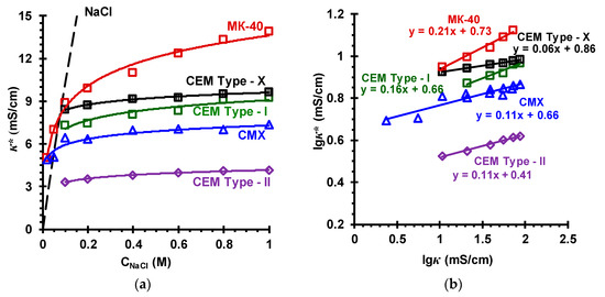 Concentration dependences of the conductivity of different cation-exchange membranes, κ*, in NaCl solutions (a) and the lgκ* vs. lgκ dependences of these membranes in NaCl solutions (b). The names of the membranes are indicated near the curves, which fit the experimental data. The dashed line in the figure (a) is the concentration dependence of the NaCl solution conductivity.