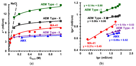 Concentration dependences of the conductivity of different anion-exchange membranes, κ*, in NaCl solutions (a) and the lgκ* vs. lgκ dependences of these membranes in NaCl solutions (b). The names of the membranes are indicated near the curves, which fit the experimental data. The dashed line in the figure (a) is the concentration dependence of the NaCl solution conductivity.