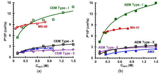 Diffusion permeability of ion-exchange membranes. Figure 9 shows the concentration dependences of the integral diffusion permeability coefficient, P, of investigated membranes in NaCl solutions. It is known [71] that the value of P (or the value of differential diffusion permeability P*, Equation (5)) is mainly determined by the rate of co-ion diffusion, which depends on the gel phase exchange capacity (), the co-ion concentration () and diffusion coefficient () in this phase, the volume fraction of electroneutral solution (f2) and the relative disposition of the gel and intergel solution phases, parameter α [59]: