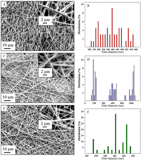 The morphologies of the three composite nanofiber membranes electrospun in the conditions reported in Table 1 were observed on the SEM micrographs presented in Figure 2, along with their respective nanofiber diameter distribution.