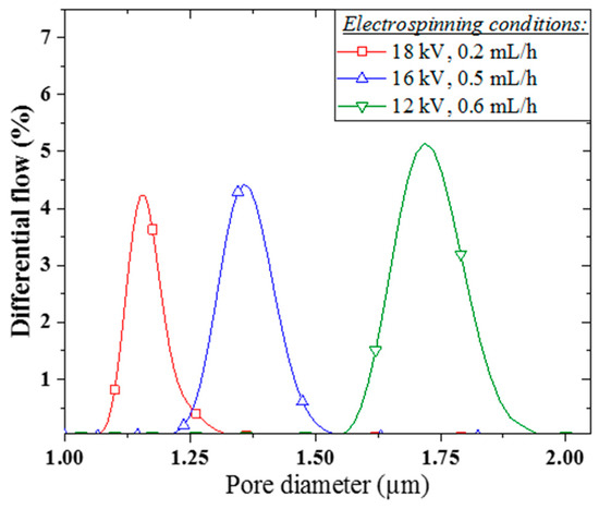 The PVA/copper membranes demonstrated a relatively narrow pore size distribution, typical from an electrospun structure, as presented in Figure 3 [35]. The average membrane pore size was determined to increase from 1.15 to 1.35 and 1.81 μm, with an also increasing full width at half maximum (FWHM) of 110, 128, and 140 nm, for decreasing voltage electrospinning conditions of 18, 16, and 12 kV respectively.