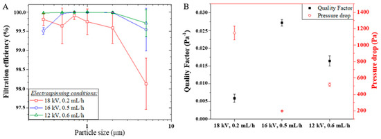 Figure 4 presents the filtration efficiency of the PVA/copper membranes in the filtration of KCl crystals of a size ranging from 0.3 to 5.0 µm, at a face velocity of 5 cm/s, along with a comparison between the membranes quality factor and pressure drop. All three membranes offered good separation performance over 99.5% in average for the [0.3, 2.0] μm particle size range, making them of comparable efficiency with the standard EPA or sub-HEPA filter ISO 25 E, according to the European norm ISO 29463-1 (2011), which categorizes FE regardless of test conditions [38]. The efficiency of the PVA/copper membranes in the removal of PM5 was found over 98% in average, thus comparable in efficiency with the standard EPA filter ISO 15 E [38]. The filtration performance given by the PVA-Copper nanofiber membranes is in agreement with other nanofiber air-filtration membranes investigated as transparent air filters, showing a filtration efficiency over 98.5% for PM2.5 [39]. For instance, poly(acrylonitrile) PAN nanofiber membranes of 858 nm average fiber diameter showed a filtration efficiency between 96.6 and 99.7% for the (0.3, 5.0) μm particle size range [27].