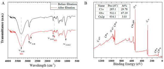 A FTIR spectra performed at the surface of a PVA/copper nanofiber web before and after air filtration test is presented in Figure 5a, showing that no absorption of KCl crystal occurred on the PVA/copper nanofibers during air filtration, from the peaks accurate superposition [44]. An XPS survey analysis at the nanofiber surface, presented in Figure 5b, revealed a relative concentration of 3 at % of copper bonds, while oxygen and carbon bonds respectively accounted for 67 and 30 at %. Considering the copper oxidation from air exposure, the organic composition of the nanofibers, and the adventitious carbon at their surface, the found percentage of surface copper bonds was deemed in agreement with a polymer-metal acetate crosslinking previously proposed in Equations (1,2). Furthermore, the presence of copper at the composite nanofibers surface attest of the anti-bacterial potential of PVA/copper nanofiber air-microfilters. The distinctive shape of the CuLMM peak and the noticeable presence of the Cu2p1/2 and Cu2p3/2 satellite peaks on the survey spectra indicate the predominant presence of a Cu (II) species, which is in adequation with CuO from surface oxidation under air exposure [45]. As the average nanofiber diameter was not found to significantly impact the filtration performance of the PVA/copper membranes, a decrease in the nanofiber diameter can thus be a potential way to increase the presence of copper at the nanofiber surface from an increased contact surface area.