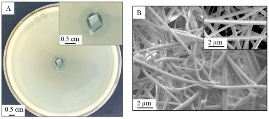 The antibacterial effect of a PVA/Copper nanofiber membrane via assessment of the inhibition zone is shown in Figure 6a according to an adapted protocol from standard ISO 20645 (2004) [28]. The nanofiber web shows an inhibition zone of 1.2 mm after 24 h of incubation from an inoculation of 1–5 × 108 CFU/mL. According to the standard protocol, an inhibition zone over 1 mm demonstrates a good anti-bacterial effect [28]. A SEM micrograph of the membrane after test is presented in Figure 6b showing a moisture resistance behavior of the nanofibers with no degradation or swelling, and limited fouling of the membrane, with no live bacteria present on the fiber web. The nanofibers do not exhibit a smooth structure anymore, with the presence of copper-based microcrystals on their surface, with a homogeneous distribution all over the fiber web.