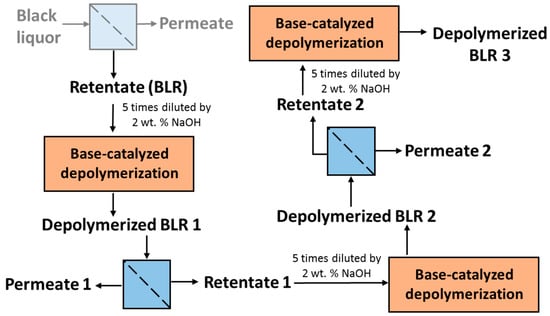 For combining depolymerization and membrane separation, the depolymerized BLR (DBLR) samples were filtered by a GR95PP membrane (2 kD MWCO) at three different temperatures, those of 170 °C, 190 °C, and 210 °C. After the membrane separation had taken place, three permeates (P170, P190, and P210) and three retentates (R170, R190, and R210) were collected for further analysis. The retentate R190 was diluted 5 times by 2 wt % of NaOH for the second round of depolymerization (with the resulting depolymerized retentate ‘2DR190’ being obtained). After the second depolymerization, another membrane filtration was performed to separate the LMMC from the 2DR190 sample, the resulting permeate (2P190) and retentate (2R190) being collected then. The retentate 2R190 was diluted 5 times again by a 2 wt % of NaOH and was depolymerized for a third time, 3DR190 being obtained. The entire process of the combined depolymerization and membrane filtration involved is shown in Figure 1.