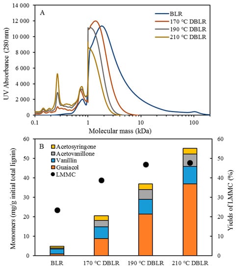 Characterization of BLR before and after depolymerization. (A) Molecular weight distributions of BLR and depolymerised BLR products, measured as UV absorbance at 280 nm. (B) The yields of lignin low-molecular mass compounds (LMMC) and the concentration of lignin monomers in LMMC before and after depolymerization. Depolymerization conditions: 5 times dilution with 2% NaOH, 170–210 °C, 120 bar, and 2 min.
