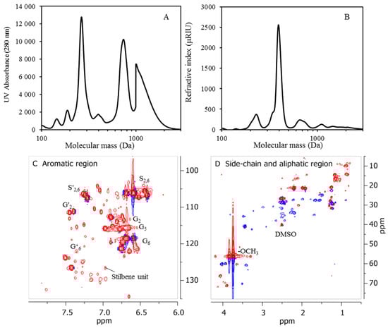 Characterization of extracted LMMC from 190 °C depolymerized BLR. (A,B) size exclusion chromatography (SEC) curves of LMMC from depolymerized BLR (measured as UV absorbance at 280 nm and refractive index). (C,D) Aromatic region, lignin side-chain, and aliphatic region of 2D HSQC NMR spectra of LMMC.