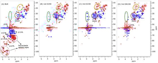 The lignin side-chain and the aliphatic region of 2D HSQC NMR spectra of the heavy fractions from (A) BLR, (B) first 190 °C depolymerized BLR (D190), (C) third 190 °C depolymerized BLR (3rd D190), and (D) third 190 °C depolymerized retentate after two rounds of depolymerization and two rounds of membrane separation (3rd DR190).
