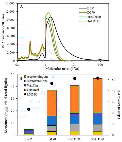 Initial 10 mL amounts of BLR, depolymerized BLR, or membrane-filtrated samples were acidified by 6 M HCl to pH 1-2, 3-Ethoxy-4-hydroxybenzaldehyde (1 mg/mL, 2 mL) being added to the lignin sample prior to acidification as an internal standard. Following acidification, each sample was centrifuged to separate the supernatant and the precipitate. The precipitate was washed 3 times by acidic water, and was then freeze-dried and was stored thereafter for further analysis. The supernatant was mixed with the washing water, and was extracted with use of 10 mL ethyl acetate three times. The extract was collected in a sample tube of known weight. The solvent was then evaporated during a gentle flow of N2, the sample tube containing the oily LMMC product that was left then being weighed. The lignin oil (the extracted LMMC) was stored thereafter at −20 °C in a freezer until analysis was carried out. Taking into consideration the recovery obtained with use of an internal standard, the theoretical yield of the lignin oil was calculated, based on the ratio of the weight of the lignin oil to that of the initial total lignin content.