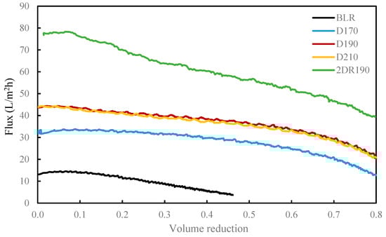 Flux during the diafiltration of 170–210 °C depolymerized BLR by GR95PP membrane. The temperature was 50 °C, the transmembrane pressure was 5.5 bar and the cross-flow was 0.5 m/s.