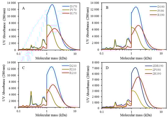 Comparison of the molecular weight distribution of untreated 170–210 °C depolymerized BLR, untreated second round 190 °C depolymerized BLR, the permeate after membrane filtration of the 4 samples, and the retentate after membrane filtration. (A) Untreated 170°C depolymerized BLR (D170), the permeate after membrane filtration (P170), and the retentate after membrane filtration (R170). (B) Untreated 190°C depolymerized BLR (D190), the permeate after membrane filtration (P190), and the retentate after membrane filtration (R190). (C) Untreated 210°C depolymerized BLR (D210), the permeate after membrane filtration (P210), and the retentate after membrane filtration (R210). (D) Untreated second round 190°C depolymerized BLR (2D190), the permeate after membrane filtration (2P190), and the retentate after membrane filtration (2DR190).