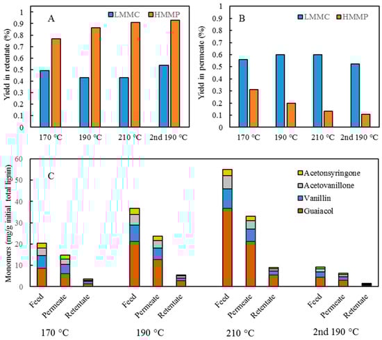 The SEC profile showed that the lignin of low molecular weight could clearly be separated from that of higher molecular weight (Figure 7D). However, the distribution of the molecular weight of the retentate following separation moved in the direction of the high-weight side, indicating a certain degree of repolymerization to have occurred during the membrane filtration process. Figure 7A,B also show more than 90% of the HMMP to be retained in the retentate, and 52.3% of the LMMC to be recovered in the permeate, as well as it being possible to obtain 67.1% of the monomers following membrane separation (Figure 8C).