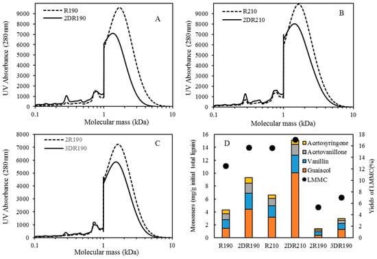 The LMMC were extracted from BLR and from depolymerized BLR. For depolymerization at 170 °C, the LMMC yields increased from 23.4% to 38.7% (of the initial lignin). When the temperature increased to 190 and 210 °C, the LMMC yields increased to 46.8% and to 47.7%, respectively (Figure 2B). The average molecular weight of LMMC was around 1000 Da (Figure 3A,B). Aromatic monomers such as guaiacol, acetovanillone, vanillin, acetosyringone, and syringaldehyde can be detected in the extracted LMMC from depolymerized BLR samples as well as from BLR raw materials. In the present study, four main monomers were selected for the monomer product comparisons and evaluations. As shown in Figure 2B, guaiacol is the main monomer product that can be produced after depolymerization, followed by vanillin, acetovanillone, and acetosyringone, in that order. Since 70% of the BLR raw material was softwood lignin, which has G-type lignin as its main structure, most of the monomers that could be detected here were G-type aromatic compounds. The content of guaiacol in BLR was only 0.825 mg/g, its increasing to 21.3 mg/g at 190 °C and to 36.8 mg/g at 210 °C. The content of vanillin, acetovanillion, and acetosyringone also showed a clear increase following depolymerization. The results regarding this show base-catalyzed depolymerization to be effective in producing LMMC from Kraft lignin.