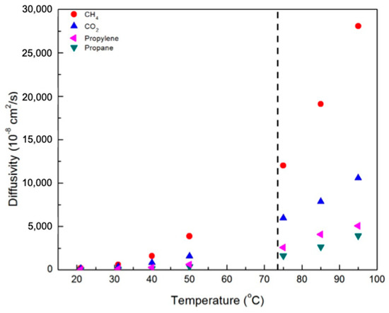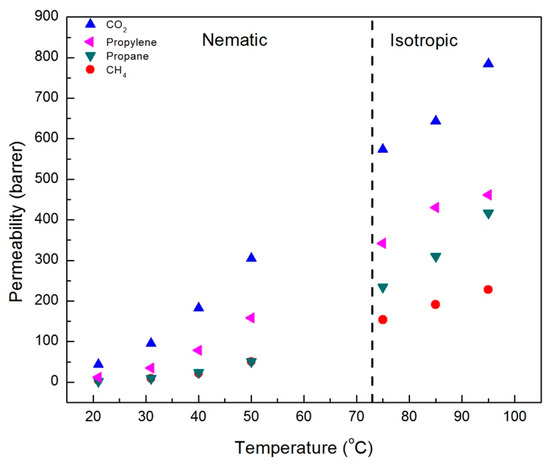 The results of single gas permeability measurements for CO2, CH4, propane, and propylene in CNBPh75_2.5 and CNBPh75_5.0 membranes are shown in Figure 5 and Figure 6, respectively. The measurements were performed over a range of temperatures both above and below the nematic–isotropic phase transition. As expected, an increase in permeability with increasing temperature is observed for all gases and both membranes. Gas permeabilities increase in the following order; CH4, propane, propylene, and CO2. A slight discontinuity in the permeation data appeared when transitioning from the nematic phase to the isotropic phase, as demarcated by the dashed line at the phase transition temperature. In addition, increasing the crosslinker content from 2.5 to 5.0 mol% results in a decrease in permeability for all gases studied. Comparison of permeation results in Figure 5 and Figure 6 suggests that the higher crosslinker content reduces the segmental motion of the polymer backbone, leading to a reduction in the diffusivity of the penetrant molecule and a lower permeability [29].