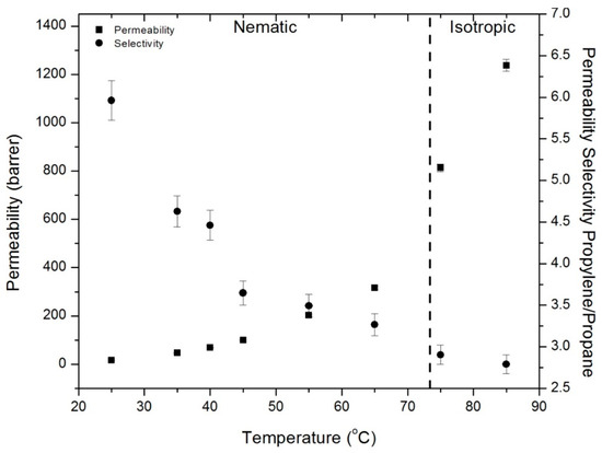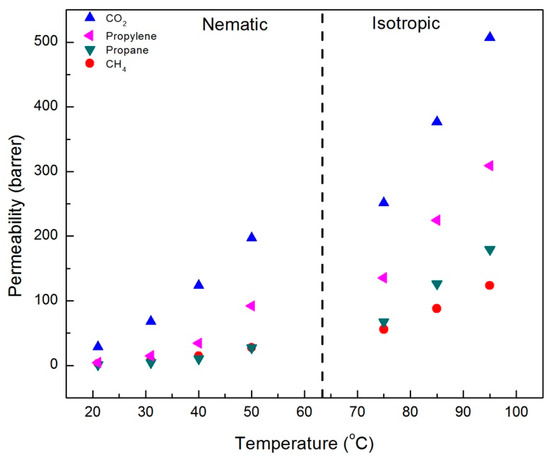 Membrane separation processes are of considerable scientific and economic interest due to their scalability and low energy requirements [1]. They also have the potential to perform separations that are difficult to achieve with other technologies; applications such as desalination, natural gas purification, and paraffin/olefin separation [2,3,4]. Liquid crystalline (LC) materials, which exhibit multiple temperature-dependent mesophases with varying degrees of order, have not received significant scrutiny as potential membrane materials. The ordering of liquid crystalline materials presents a unique opportunity for gas separation processes, which rely on shape and size differences of the penetrants at the atomic level. LC materials offer several options for tuning and controlling mass transport behavior, such as molecular orientation and temperature-dependent phase behavior. The structure and molecular morphology of the membrane material have a direct effect on the gas transport mechanism [5]. Membrane preparation procedures can have significant impacts on membrane performance for a given material [6,7]. In particular, thermal treatment of polymeric films has an effect on gas permeation. Increasing the curing temperature of the polymer films has been shown to increase the packing density of the polymer films, resulting in a decreased gas transport and increased selectivity [8]. For our study, we maintained the curing temperature, pressure, and cooling/heating ramp rate to mitigate any hysteresis effects.
