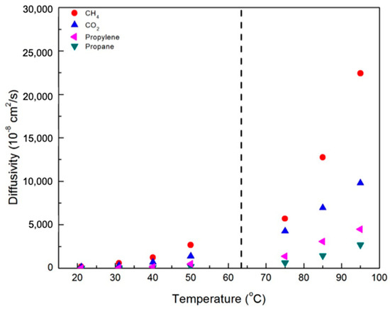 Figure 7 and Figure 8 contain plots of the diffusivities of gases in the CNBPh75_2.5 and CNBPh75_5.0 membranes, respectively, determined using the time-lag method. Diffusivity increased with temperature and decreased with increasing crosslinker content for all gases studied. This confirms that the increased cross-link density in the CNBPh75_5.0 membrane leads to decreased polymer backbone mobility. Diffusivities for the different gases studied were clearly dependent on the size of the penetrant molecule and decreased with increasing Lennard-Jones gas diameter: CH4 (3.76 Å) > CO2 (3.94 Å) > propylene (4.68 Å) > propane (5.12 Å). These results are consistent with the kinetic model proposed in the literature, which assumes that the diffusion of molecules occurs as a series of consecutive jumps facilitated by the temporary opening of the polymer matrix as a result of molecular fluctuations [30].