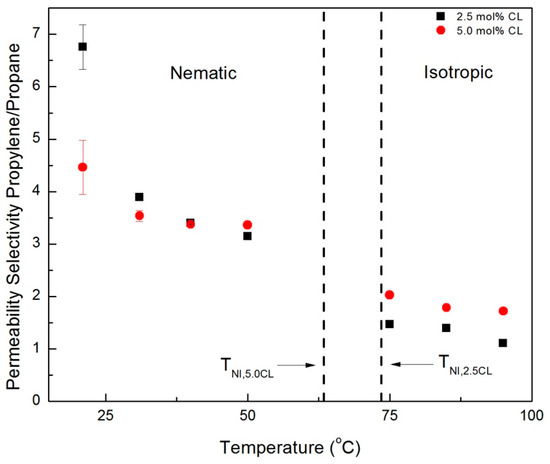 Propylene/propane permeability selectivities in the nematic and isotropic phases for membranes prepared with 2.5% and 5.0% crosslinker (CNBPh75_2.5 and CNBPh75_5.0).
