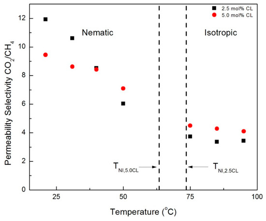 CO2/CH4 permeability selectivities in the nematic and isotropic phases for membranes prepared with 2.5% and 5.0% crosslinker (CNBPh75_2.5 and CNBPh75_5.0).