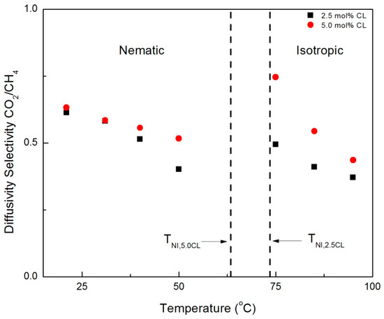 The crossover of permeability selectivity between the CNBPh75_2.5 and CNBPh75_5.0 membranes with increasing temperature in the nematic phase may be attributed to differences in the temperature-dependent diffusion selectivity in each membrane. Figure 11 and Figure 12 compare diffusion selectivity in the CNBPh75_2.5 and CNBPh75_5.0 membranes for the gas pairs propylene/propane and CO2/CH4 over a range of temperatures in the nematic and isotropic phases. Diffusion selectivities for propylene/propane exhibited a dependence on temperature and crosslinker content similar to that observed for permeability selectivities. In the nematic phase, the CNBPh75_2.5 membranes exhibited higher diffusion selectivities at lower temperatures compared to the CNBPh75_5.0 membranes. At higher temperatures, the CNBPh75_5.0 membranes exhibited higher diffusion selectivities. In contrast, the CO2/CH4 diffusion selectivity was less than one over the whole temperature range, as expected based on the relative Lennard-Jones diameters of the two molecules. The permeability selectivity remains greater than one because of the higher CO2 solubility in the membrane. The CO2/CH4 diffusion selectivity was lower in the CNBPh75_2.5 membrane (i.e., was more selective for CH4) than in the CNBPh75_5.0 membranes. In the nematic state, CO2/CH4 diffusion selectivity in the CNBPh75_2.5 membrane decreased with increasing temperature at a higher rate than CNBPh75_5.0. Increasing the temperature above the isotropic transition resulted in a distinct jump in the CO2/CH4 diffusion selectivities in both membranes. This jump is not observed for the propylene/propane diffusion selectivities, suggesting that the diffusivity of CO2 is more strongly impacted by the ordering in the nematic phase. This could be due to specific interactions between the CO2 molecules and the polar cyano group on the mesogenic side chains [31].