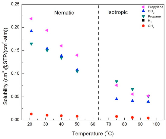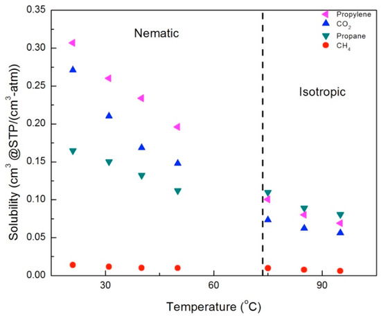 In general, the solubility decreased with increasing temperature in both the nematic and isotropic phases; however, there were distinct changes in behavior across the nematic–isotropic transition. In the isotropic phase, the relative solubilities of the gases studied ordered from the highest to the lowest solubility are propane > propylene > CO2 > CH4. In contrast, the ordering of solubilities in the nematic state is propylene > CO2 > propane > CH4. Thus, propylene and CO2, gases with a charge separation, exhibit higher solubilities than propane and CH4 in the nematic phase, in both the 2.5% and 5.0% crosslinker membranes. This suggests that increased sorption of CO2 and propylene is due to the ordering of the LC mesogens, which enhances the interactions between gases with a charge separation and the mesogenic groups.