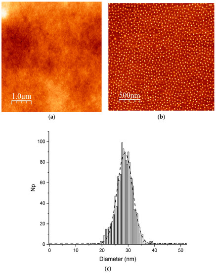The self-assembly behavior of PMMA-b-PSBMA block copolymer was then investigated in various solvents. Firstly, we prepared a solution of THF: water mixture 1:1 in volume by drop wise addition of water in a solution of PMMA-b-PSBMA block copolymer at 5 wt % in THF and let it stir for 8 h. Afterwards, lots of aggregates were found in the solution, thereby preventing any subsequent use. In the second trial, we prepared a solution of NMP: water mixture 1:1 in volume by addition of water at 60 °C to destabilize the aggregates but still lots of aggregates were observed. Similar results were obtained with a N,N-dimethylacetamide-water mixture. The micellization process from PMMA-b-PSBMA block copolymer is actually a problem due to the initial lack of PSBMA solubility in THF. Solutions were thus prepared in TFE with 5 wt % of PMMA-b-PSBMA block copolymer stirred for 1 h. The homogeneous solution was then drop casted onto silicon wafer and dried at 25 °C for 8 h. A thin and homogeneous film was obtained and analyzed using AFM. As expected, no micelles were observed in the film (Figure 1a), given the non-selective nature of this solvent. Micelles were then produced by dissolving the block copolymer (5 wt %) in TFE, followed by a drop wise addition of water until reaching a TFE: water ratio of 1:1 in volume over a period of 30 min at 60 °C. After stirring at 25 °C for 5 h, a clear solution with no aggregates was obtained and drop casted onto a silicon wafer. Isolated nanoparticles with a diameter of about 30 nm with narrow size distribution (Figure 1c) were observed by AFM (Figure 1b).