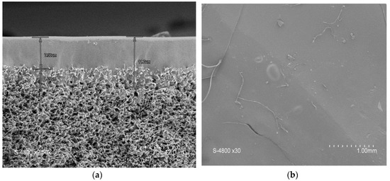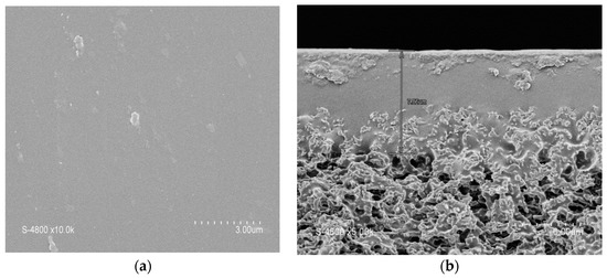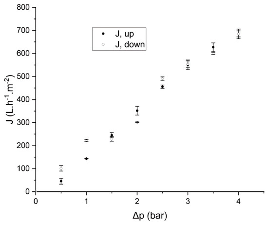 The membrane showed a steady increase in flux as the pressure increased (Figure 5) with a permeability (Lp) of 188 L·h−1·m−2·bar−1. No significant hysteresis was found when measuring the water flux while decreasing the pressure (Lp = 170 L·h−1·m−2·bar−1). The stability of the block copolymer layer was further confirmed by SEM after water permeation (Figure 6), which showed the membrane’s integrity.