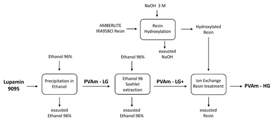 Firstly, PVAm present in Lupamin 9095 solution was precipitated by adding ethanol to the polymeric solution to reach a 4:1 alcohol/solution volume ratio; the precipitated fraction of polymer was then recovered, dried in oven at 60 °C overnight and stored with the label of PVAm-LG (Low Grade).