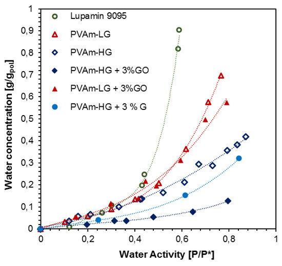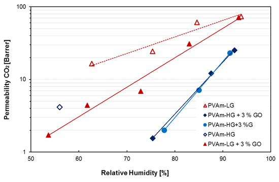 Regarding PVAm-HG, it is quite interesting to notice how no particular differences in gas permeability can be discerned between the materials obtained using two different fillers. This could be contradictory considering that GO usually presents a higher aspect ratio than few-layers graphene and that PVAm-HG + GO showed a lower water uptake than PVAm-HG + G. Usually, indeed, when no other factors are in play, a lower concentration of humidity in the matrix resulted in a lower CO2 permeability, as also shown by previous works [26,27,32,37,39,40]. The fact that the two composites show comparable permeabilities therefore suggests the existence of a different structure and possibly of higher interaction of carbon dioxide with the polarly charged GO, which increase the intrinsic materials permeability thus compensating negative factor mentioned above.