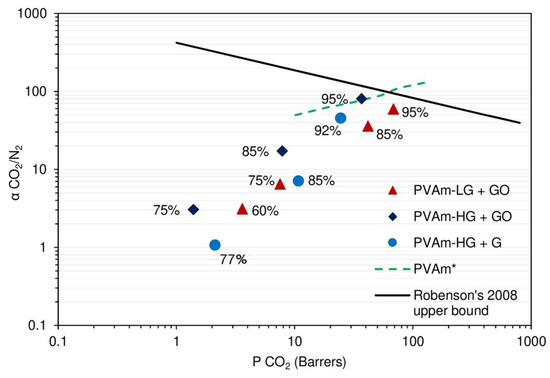 Analyzing PVAm-LG and -HG reinforced with graphene oxide, therefore, it resulted that the low-grade polymer has higher maximum CO2 permeability (≈70 Barrer), with lower CO2/N2 selectivity (≈60) compared to the high-grade one, which has higher selectivity (≈80) and lower permeability (≈35 Barrer). These differences are probably due to the swelling difference of the two composite materials, as already discussed, and shows a PVAm-LG + 3% GO more hydrophilic than the PVAm-HG-based composite. These results fit also with the chemical structure differences between the two materials: PVAm-HG has an almost totally neutral charge upon the polymeric chain, leading to a tighter packing of the chain itself, which cause the overall lower permeability, while the PVAm-LG material has much higher ionic repulsion [56]. Nevertheless, the higher neutral secondary amine group concentration in PVAm-HG promotes the facilitated transport mechanism shown in Figure 1 and Equations (1)–(5), which results in higher CO2/N2 selectivity.