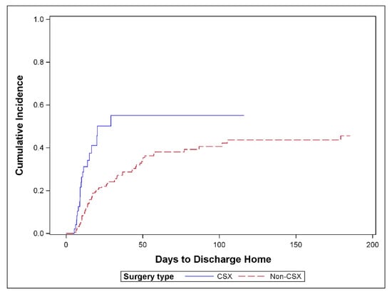 Figure 2 shows the cumulative incidence of TTDH by CSX admission, and demonstrates that CSX patients were discharged home at a higher rate than surgical ICU patients (p = 0.001).
