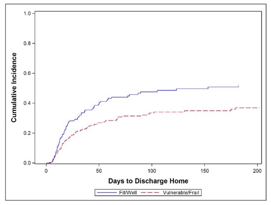Time to discharge to home (TTDH) was defined as the time from hospital admission to discharge home. Death or discharge to palliative care or a long-term care facility were considered competing risks precluding eventual discharge home, while discharge to another hospital, ICU, rehab or “other” were treated as censoring events. TTDH was depicted using cumulative incidence function curves showing the proportion of patients who returned home over time. The difference between groups in the cumulative incidence function curves was tested by Gray’s method and summarized by the sub-distribution hazards ratio (SHR) [,,]. All tests are two-sided without correction for multiplicity. The analysis was performed using SAS version 9.4 (SAS Institute Inc., Cary, NC, USA).