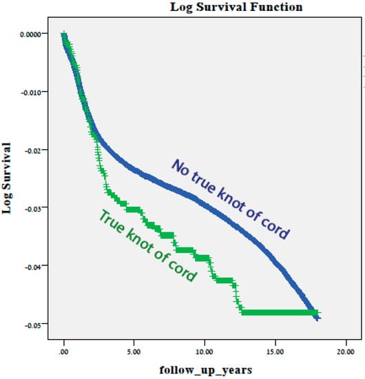 Log of survival, total neurological hospitalizations up to the age of 18 years by presence or absence of true knot of cord * (* log rank test p = 0.120).