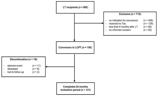 Study design. A total of 865 liver transplant (LT) recipients were screened for eligibility. During the enrolment 150 patients fulfilled the inclusion criteria and were switched to once-daily MeltDose® tacrolimus (LCPT). Clinical data were analyzed in a 24-month follow-up.