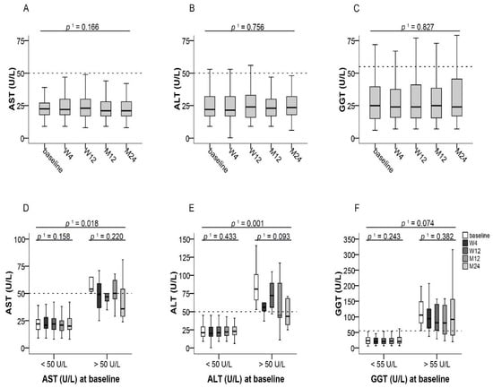 Liver transaminases after switching to LCPT. (A–C): Boxplots show median values with 95% CI for AST, ALT, and GGT at the baseline visit as well as at weeks 4 and 12 and at months 12 and 24; (D–F): Boxplots show median values with 95% CI for AST, ALT, and GGT according to normal or increased transaminase values at baseline. 1 with Greenhouse–Geisser correction; ALT: alanine amino transferase, AST: aspartate amino transferase, GGT: gamma-glutamyl transferase, LCPT: once-daily MeltDose® prolonged-release tacrolimus, M: month, W: week.