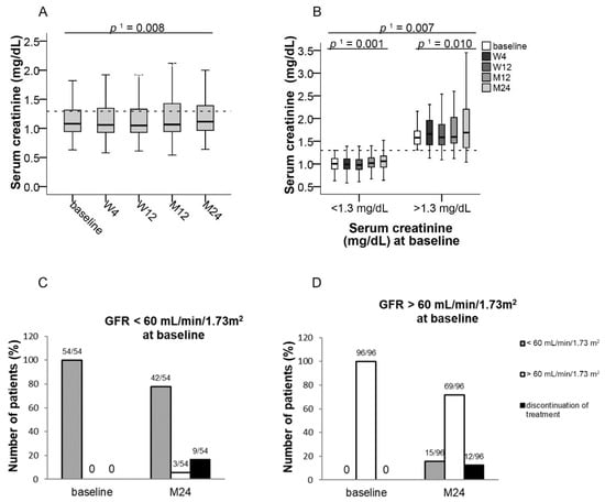 Median serum creatinine and GFR after switching to LCPT at the baseline visit as well as at weeks 4 and 12 and at months 12 and 24. Boxplots show median values with 95% CI (A) for serum creatinine and (B) for serum creatinine according to normal or increased values at baseline; (C,D) show the number of patients for GFR categories < or > 60 mL/min/1.73 m2 at baseline and at 24 months who initially (C) had a GFR < 60 mL/min/1.73 m2 or (D) had a GFR > 60 mL/min/1.73 m2; 1 with Greenhouse–Geisser correction; GFR: glomerular filtration rate, LCPT: once-daily MeltDose® prolonged-release tacrolimus, M: month, W: week.