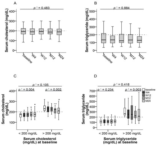 Blood lipids after switching to LCPT. (A) Boxplots show median values with 95% CI for cholesterol and (B) triglycerides at the baseline visit as well as at weeks 4 and 12 and at months 12 and 24; (C) Boxplots show median values with 95% CI for cholesterol and (D) triglycerides according to normal or increased respective values at baseline. 1 with Greenhouse–Geisser correction; * p ≤ 0.05, *** p ≤ 0.001; LCPT: once-daily MeltDose® prolonged-release tacrolimus, M: month, W: week.