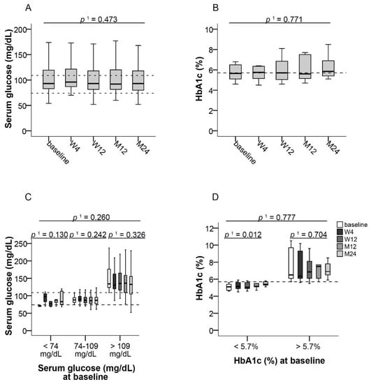 No significant change of HbA1c was observed in the whole study population from baseline to month 24 (Figure 5B). In patients with an initial HbA1c level ≤5.7%, median HbA1c values significantly increased by 0.3% from 5.1% (95% CI, 4.6–5.6) to 5.4% (95% CI, 5.1–5.8) at month 24 (p ≤ 0.012, f = 0.92), whereas no change was observed in patients who initially had HbA1c values >5.7% (Figure 5D).
