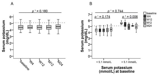 Median potassium levels were constant during the 24-month observational period in the whole study population (Table 2 and Figure 6A). No change was observed in patients with normal potassium levels (3.5–5.1 mmol/L) at baseline, whereas patients with initially increased potassium levels showed a significant decrease of median potassium by 0.6 from 5.5 (95% CI, 5.3–6.0) to 4.9 mmol/L (95% CI, 4.0–5.6) at month 24 (p ≤ 0.006, f = 0.74) (Figure 6B).