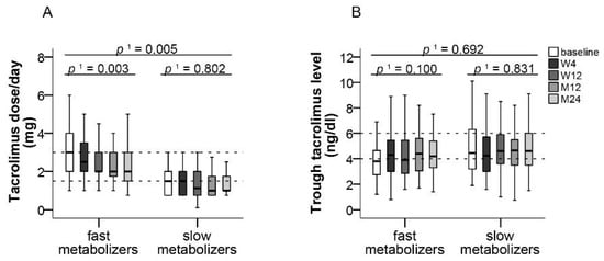 Tacrolimus dose and trough level in slow and fast metabolizers. Boxplots show median values with 95% CI for (A) tacrolimus dose and (B) tacrolimus trough level according to the categories of slow and fast metabolizers, both at the baseline visit as well as at weeks 4 and 12 and at months 12 and 24. 1 with Greenhouse–Geisser correction; M: month, W: week.