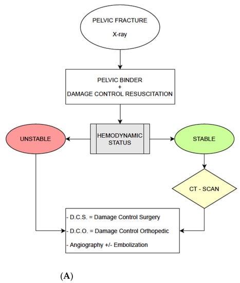Firstly, we considered the management of patients at the ASST Niguarda Trauma Center until 2009, following the model our group explained in the previous work we cited. In patients with pelvic fractures and a hemodynamically unstable condition, a pelvic binder was placed compressing at the level of great trochanters and a Damage Control Resuscitation with fluids and blood products was started. If Extended-Focus Assessment with Sonography for Trauma (E-FAST) exam was positive for free pelvic fluid and X-ray confirmed a pelvic fracture, confirming an unstable condition, we used to access directly to the OR to perform laparotomy, AE and external fixation of the fracture if necessary (Figure 2A).